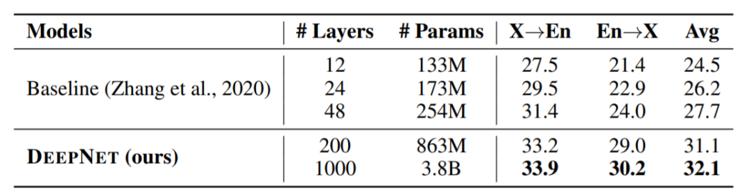 DEEPNET可以成功地将深度扩大到1000层,比基线提高了4.4 BLEU。而且DEEPNET只训练了4个epoch,如果有更多的计算预算,其性能还可以进一步提高。