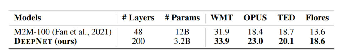 利用这些数据,我们用100层编码器、100层解码器、1024个隐藏维度、16个头和4096个中间维度的前馈层来训练DEEPNET,结果如下: