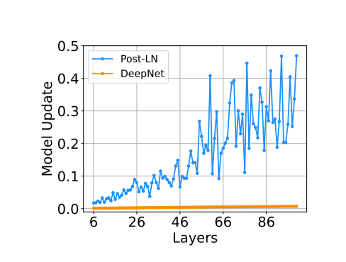 从该图中我们可以看出,DEEPNET比Post-LN有更稳定的更新。