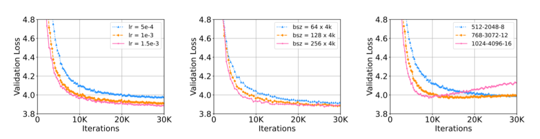 在每个实验中只改变一个超参数,其他超参数固定。上图所示为WMT-17验证集上的损失曲线。