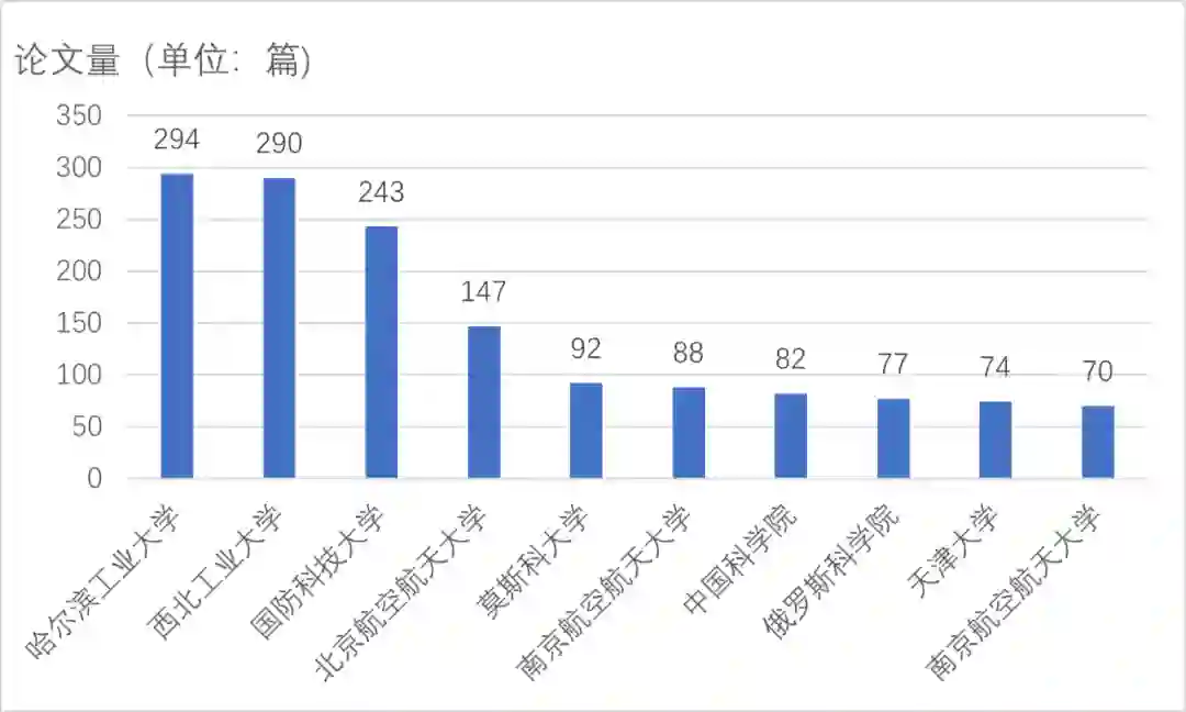 从全球范围看,在高超音速科研论文发表量前十强机构之中,有 7 所来自中国、2 所来自于俄罗斯、1 所来自美国,如图 4 所示。这反映出中国机构在高超音速领域的研究力量较强。高超音速论文量前十强的机构依次是哈尔滨工业大学、西北工业大学、国防科技大学、北京航空航天大学、莫斯科大学、南京航空航天大学、中国科学院、俄罗斯科学院、天津大学、南京航空航天大学。