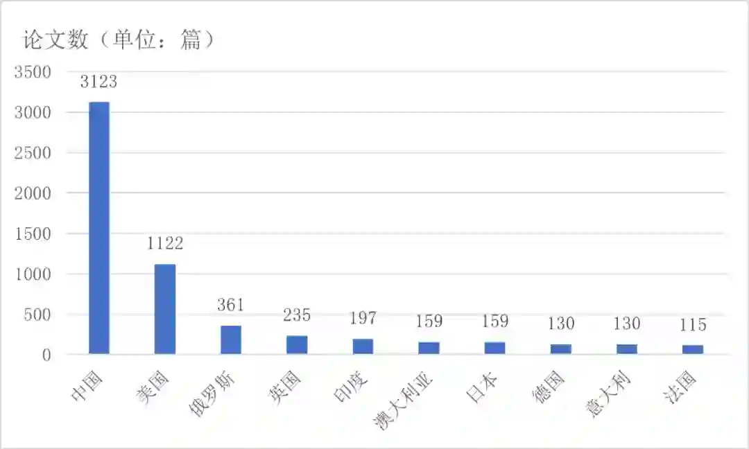 在近20多年的高超音速相关论文之中,论文发表量前十国家依次是中国、美国、俄罗斯、英国、印度、澳大利亚、日本、德国、意大利和法国,如图 1所示。其中,中国的相关论文发表量居于全球领先位置,美国、俄罗斯分别居于第二、三位。