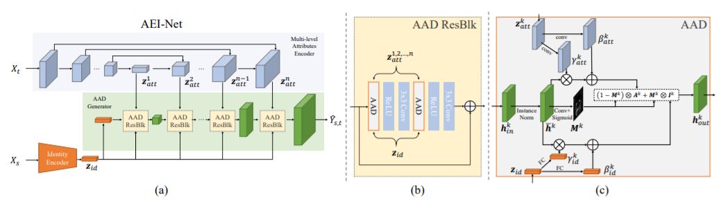 第一阶段的AEI-Net结构。AEI-Net由身份编码器,多级属性编码器和AAD生成器组成。AAD生成器使用在AAD层上构建的级联AAD ResBlk,可在多个功能级别中集成图像特征和属性的信息