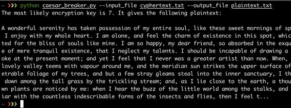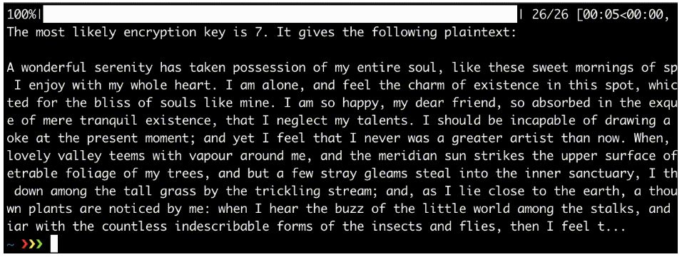 click.echo(f'The most likely encryption key is {best_key}. It gives the following plaintext:\n\n{best_plaintext[:1000]}...')