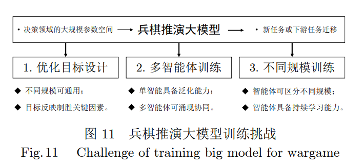博弈理论,作为研究多个利己个体之间的策略性交互而发展的数学理论,有望为兵棋推演人机对抗突破提供理论支撑,但是面临着如何求解以及保证大规模博弈的近似纳什均衡解的挑战。大模型,近些年来在自然语言处理领域获得了突飞猛进的发展,兵棋推演的大模型训练有望实现类似的零样本或小样本迁移,但是面临着如何进行优化目标设计、多智能体训练以及不同规模任务训练的挑战。问题约简,作为一种引导技术发展的有效手段,本文设计了“排兵布阵”、“算子异步协同对抗”等问题,以牵引算法研究,进而反哺解决兵棋推演人机对抗挑战。