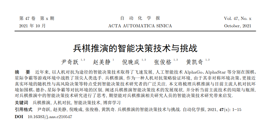 尹奇跃, 赵美静, 倪晚成, 张俊格, 黄凯奇, 兵棋推演的智能决策技术与挑战. 自动化学报, 2022, 48(x): xx-xx