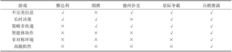 兵棋推演, 一直以来都是战争研究和训练的手段, 分为早期的手工兵棋与 20 世纪 80 年代后期普 及的计算机兵棋[15−17] . 胡晓峰等人[6] 全面综述了兵 棋推演的基本要素 (参演人员、兵棋系统模拟的战 场环境和作战部队、导演部及导调机构), 指出 “兵 棋推演的难点在于模拟人的智能行为”, 进而得出 “兵 棋推演需要突破作战态势智能认知瓶颈”, 最后给 出了如何实现态势理解与自主决策可能的路径. 和 目前兵棋推演关注的重点不同, 本文关注的是兵棋 推演中的智能体研究, 针对通用性的智能决策技术 与挑战展开. 另外, 需要阐明的是, 本文中的兵棋推 演, 如非特别阐述, 在不引起歧义的前提下统一指 双方计算机兵棋推演 (红蓝两方). 本文内容组织如下: 第二章将梳理兵棋推演与 目前主流人机对抗环境如星际争霸等的区别, 以及 为什么其潜在是人机对抗的下一个挑战; 第三章将 介绍兵棋推演智能技术的研究现状; 之后在第四章 阐述当前主流技术的瓶颈; 第五章对兵棋推演的智 能决策技术进行展望与思考, 希望启发新的研究方 向; 最后对全文进行总结.