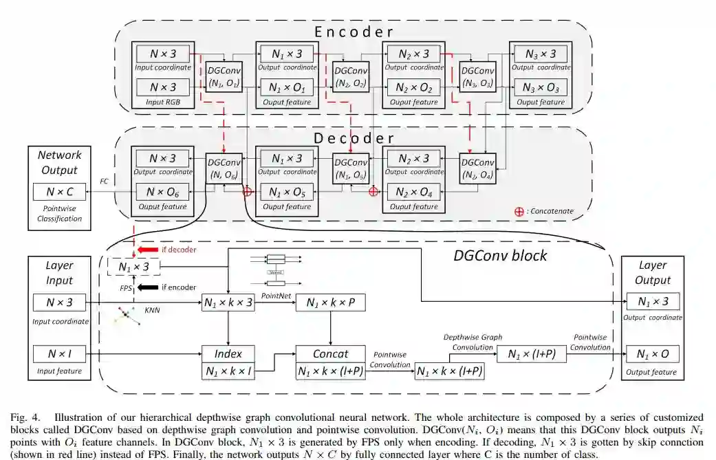 图4 我们的分层深度图卷积神经网络的示例。整个架构由一系列基于深度图卷积和逐点卷积的称为DGConv的定制块组成。DGConv(Ni,Oi)表示该DGConv块输出具有Oi特征通道的Ni点。在DGConv块中,仅在编码时由FPS生成N1×3。如果解码,则通过跳过连接(以红线显示)而不是FPS获得N1×3。最后,网络通过完全连接层输出N×C,其中C是类的数量。