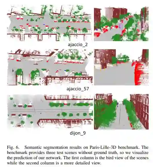 图6 Paris-Lille-3D基准测试的语义分割结果。基准测试提供了三个没有真实值的测试场景,因此我们可视化我们网络的预测。第一列是场景的鸟瞰图,第二列是更详细的视图。