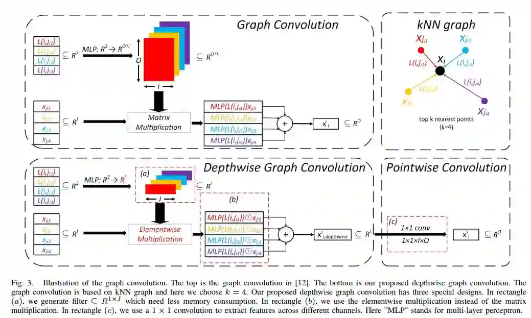 图3 图卷积的示例。顶部是参考文献[12]中的图卷积。底部是我们提出的深度图卷积。图形卷积基于kNN图并且这里我们选择k = 4。我们提出的深度图卷积有三种特殊设计。在矩形(a)中,我们设计了消耗内存较少的滤波器⊆R1×I。在矩形(b)中,我们使用元素乘法而不是矩阵乘法。在矩形(c)中,我们使用1×1卷积来提取不同通道的特征。这里“MLP “代表多层感知器。
