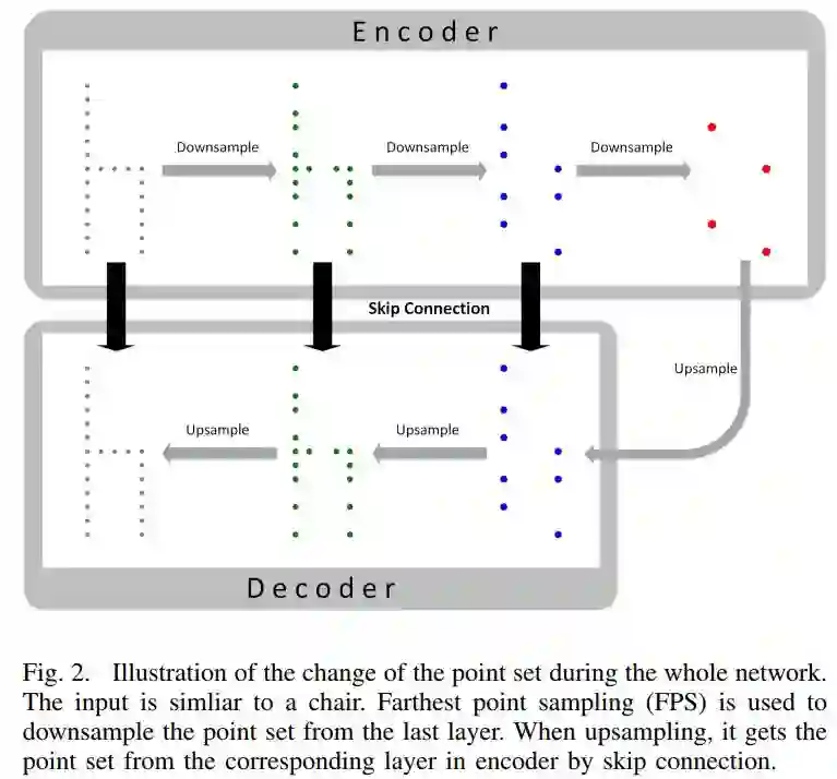 图2 在整个网络中点集变化示例。输入点集的形状与椅子相似。最远点采样(FPS)用于对最后一层的点集进行下采样。上采样时,它通过跳过连接从编码器中的相应层获取点集。
