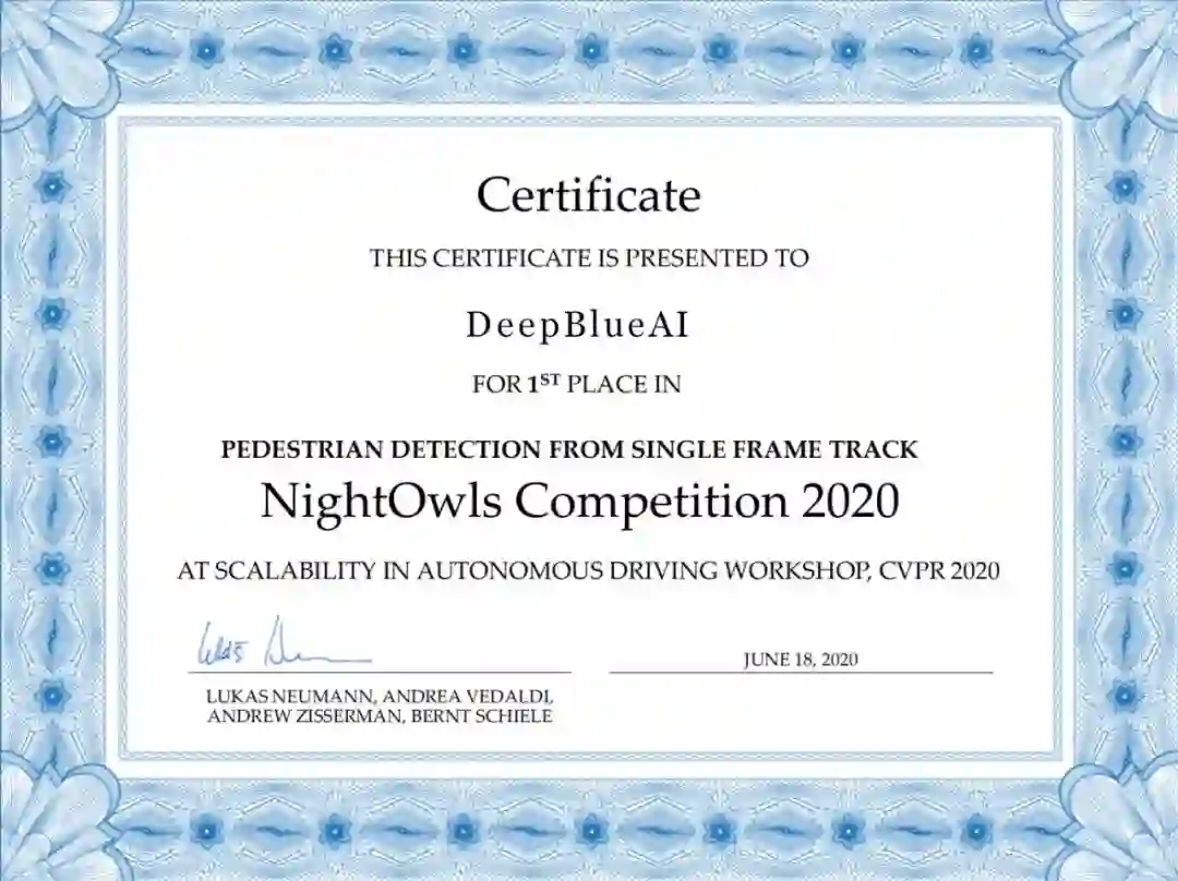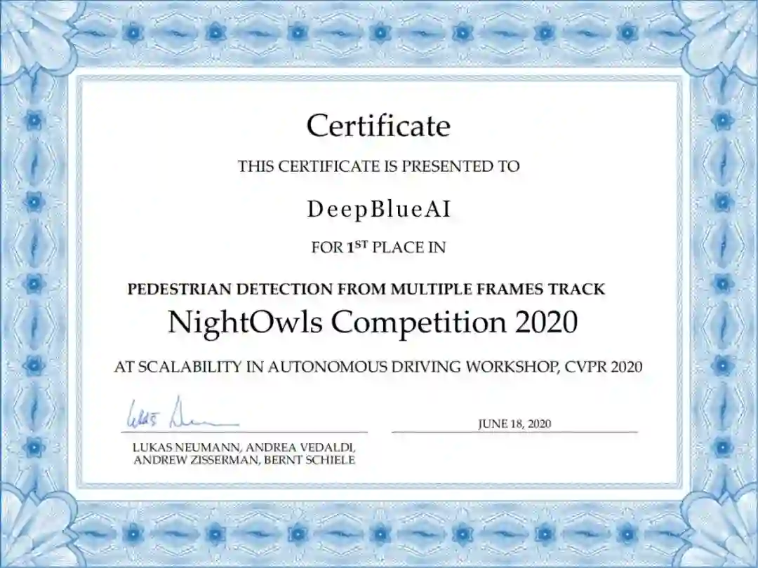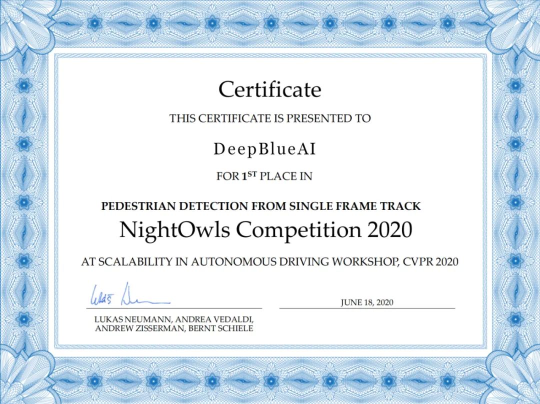 在 CVPR 2020 Workshop 举办的 NightOwls Detection Challenge 中,来自国内团队深兰科技的 DeepBlueAI 团队斩获了“单帧行人检测”和“多帧行人检测”两个赛道的冠军,以及“检测单帧中所有物体”赛道的亚军。