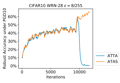 论文中的方法 ATAS 中的自适应步长允许更大的步长,而不会导致模型灾难性过拟合现象。如下图所示作者显示了 ATTA 和 ATAS 之间的比较。即使 ATAS 的步长大于 ATTA,它不会像 ATTA 那样出现模型过拟合现象。