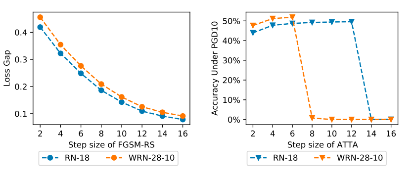 如下图所示,可以发现等当增加 ATTA 中的训练步长时,ATTA 和 PGD10 之间的损失函数的间隙会变小。此外,当步长不是太大的时候,分类模型的鲁棒精度会随着步长增加。进而可以得出初步结论,较大的步长也增强了 ATTA 的攻击能力。然而,大步长也会导致 ATTA 发生模型过拟合现象。