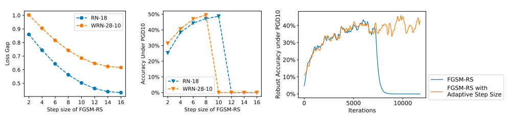 由之前的研究可知,对抗训练目标函数中内部最大化的步长对单步攻击方法的性能起着重要作用。过大的步长会将所有 FGSM 对抗扰动吸引到分类边界附近,导致灾难性过拟合现象,因此 PGD 多步攻击下的分类器对抗鲁棒性精度将降至零。然而,又不能简单地减小步长,因为如下图的第一张图和第二张图所示可以发现,增大步长可以增强对抗攻击并且能提高模型鲁棒性。