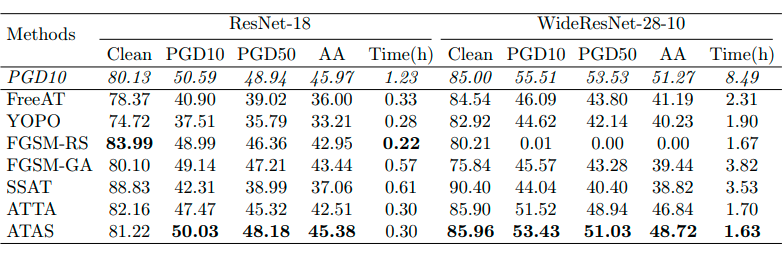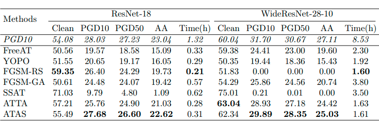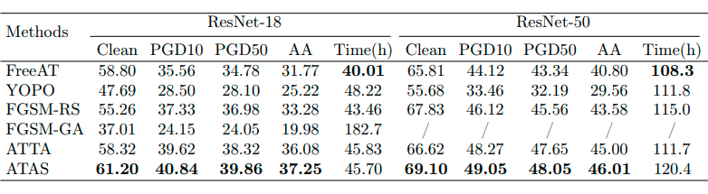 以下三个表格分别显示了不同方法在 CIFAR10、CIFAR100 和 ImageNet 数据集上的准确性和训练时间。需要注意的是,由于计算复杂性,作者没有足够的计算资源在 ImageNet 上执行标准对抗训练和 SSAT。作者使用两个 GPU 来训练 ImageNet 的模型,对于 CIFAR10 和 CIFAR100,作者在单个 GPU 上评估训练时间。从以下结果可以直观的发现论文中提出的方法 ATAS 提高了在各种攻击(包括 PGD10、PGD50 和自动攻击)下的分类模型的鲁棒性,并且可以发现在训练中避免发生模型灾难性过拟合现象。