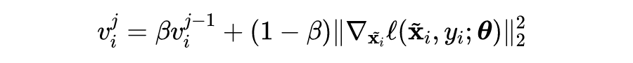 为了尽可能加强攻击并避免灾难性的过拟合现象,对于具有大梯度范数的样本,作者使用小步长来加强攻击防止模型过拟合现象;对于具有小梯度范数的样本,作者使用大步长来加强攻击。所以,作者使用梯度范数的移动平均值: