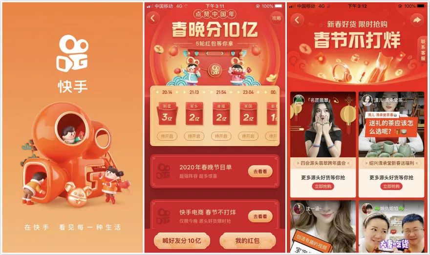 这一年,快手凭借40亿成本接棒百度,夺得2020年春晚独家互动伙伴资格,快手以“点赞中国年”为红包互动主题,并采用“视频+点赞”的全新玩法,发放创春晚红包互动历史新高的10亿元现金红包。快手方面称,其春晚红包并不是单纯的“一键领取”,更重要的是通过点赞、看视频的形式,让人们融入节日的喜庆氛围。