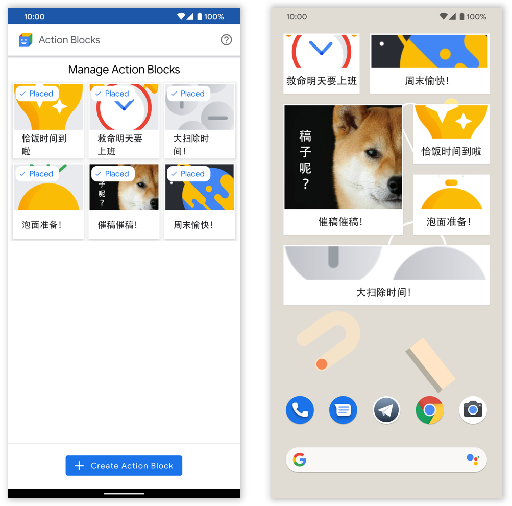 Action Blocks 对于日常生活中常常需要用到 Google Assistant 的人而言无疑是一个「必备」应用,它把常用的语音指令都变成了可以点击触发的图形方块,不管是放在主屏还是单独用一个页面来进行收纳,用起来都会非常方便。