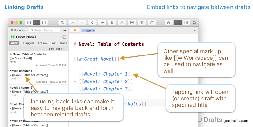 Drafts (iOS / macOS):支持类似 Wiki 样式写法的跨文档超链接功能,增加多种标记和检索语法等。