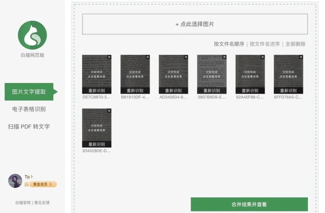 白描网页端与移动端一样,支持文字和表格的扫描识别,你只需要将想要扫描的图片文件上传至网页端即可。白描网页端支持批量扫描最多 50 张照片,在完成扫描后,你还能一次性合并所有结果,导出为 DOCX 文件或 TXT 文件。