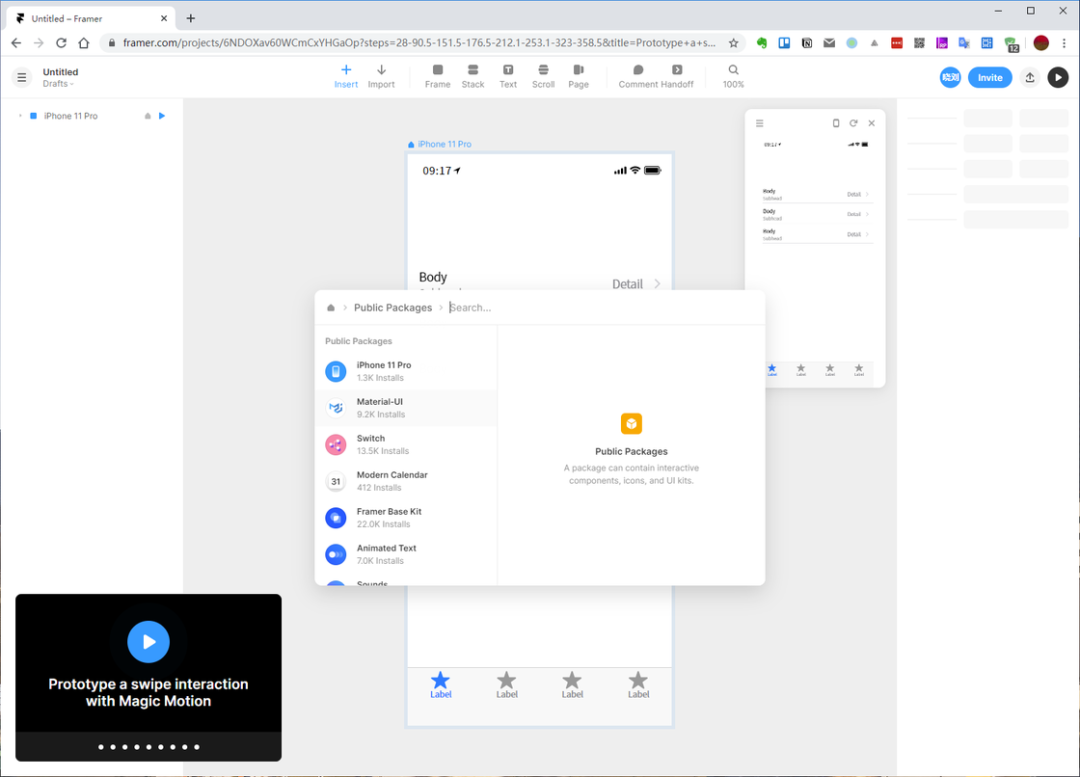 虽说 Framer 算是比较新的平台,但是你依旧可以非常轻松地找到各种平台上的样式规范和组件,只需要动动手搜索即可,添加好对应的样式库只需要新建设备画板就可以将需要的组件拖入到画板中进行设计了,不过 Framer 定位在原型设计上,所以要想做一系列的组件和元素的效果,可以选择将 Figma 的设计文件导入到 Framer 的项目中。