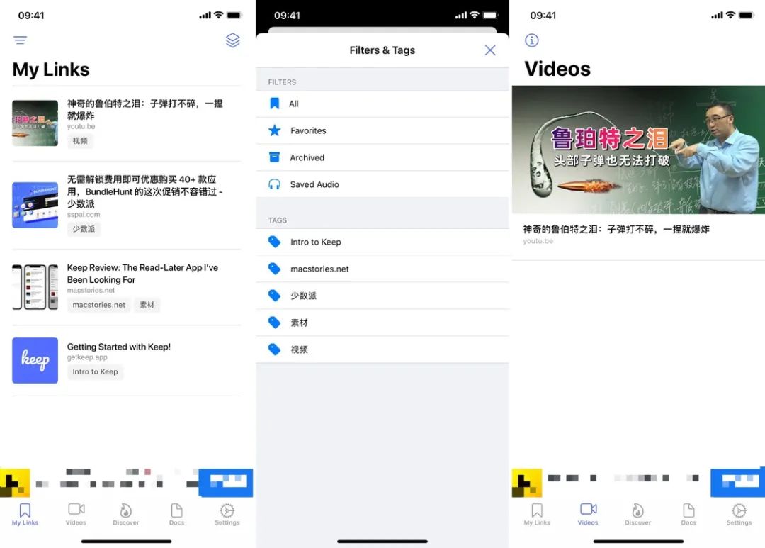 被添加到 Keep 里的网页会自动添加上域名的标签,你可以手动为它们打上标签用作分类筛选。如果你添加的链接里有 Keep 所支持的视频网页(比如 YouTube 或 Vimeo),那么它还会被自动添加到「Video」分类下,这里就相当于一个「稍后观看」的视频列表。音频和 PDF 也同样支持自动分类,不过音频并没有单独的界面,你可以在主界面左上角的「Filters & Tags」里找到「Saved Audio」。