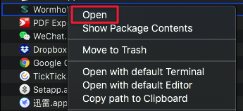 以通过 Mac 操作 iPhone 为例,你需要先 下载 Wormhole 的 macOS 版本应用。在我体验 Wormhole 时,由于该应用的签名问题,第一次打开时会提示你移动到废纸篓。此时可以找到应用安装目录,点击鼠标右键进行打开。