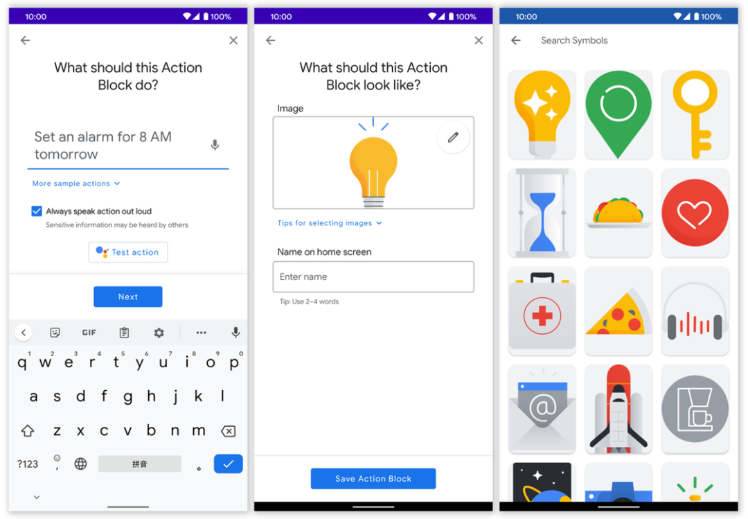 为了让这些 Google Assistant 日常指令更加方便易用,Google 上周在 Play 商店中上架了一款名为 Action Blocks 的官方应用,这款应用与 Siri 快捷指令的用法类似,初版完成度又有点类似小米的小爱捷径。借助这款应用,我们可以将大部分需要语音、文字输入才能执行的 Google Assistant 指令「图形化」,变成一个个图形开关放在桌面,最终实现一触直达的自动化效果。