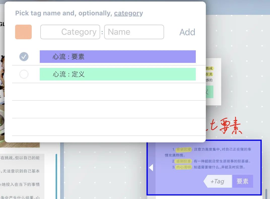 Category 的加入让我们在阅读专业文献时能有更加清晰的逻辑,比如一篇文章引用了多名作家的观点,你就可以在摘抄时将作家名添加至 Category,并在 Name 里输入想要打上的标签。