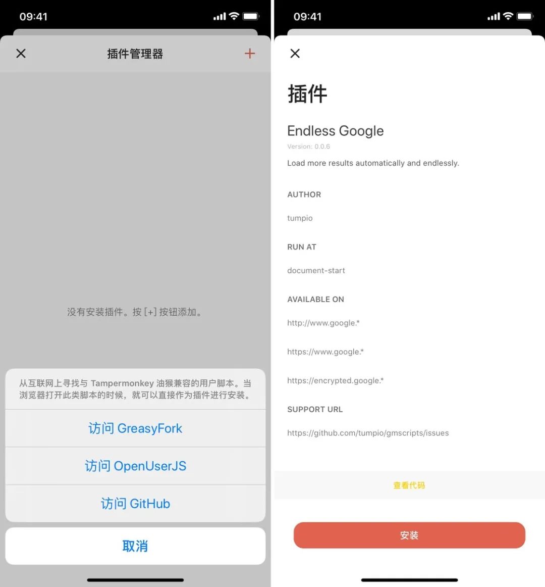 你只需要在应用的网页菜单里找到「插件」,即可管理已安装的插件或是安装新的插件。你可以在 GreasyFork、OpenUserJS 等网站上找到优秀的油猴脚本,并直接安装到 Gear Browser 里。由于部分脚本并非针对移动设备进行设计的,因此这些脚本有可能出现无法使用的情况。