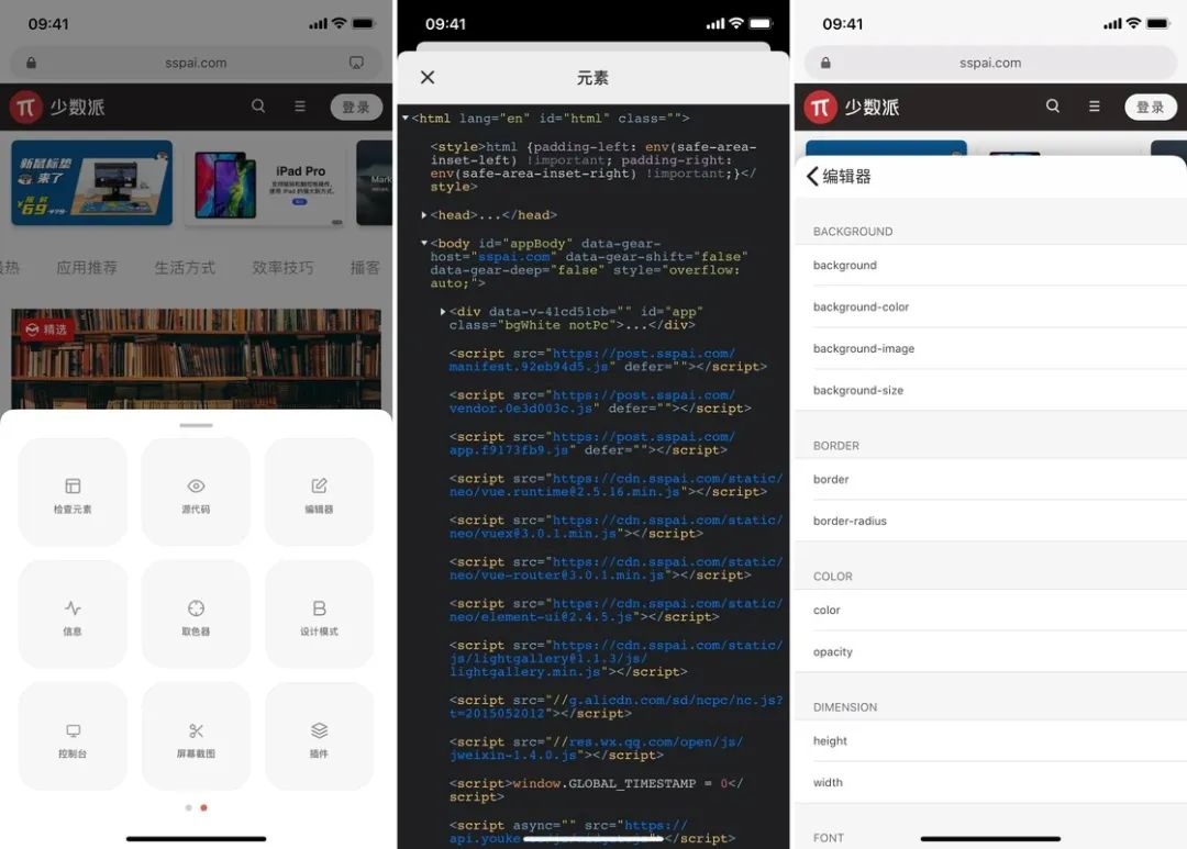 除了支持安装脚本以外,Gear Browser 还支持丰富的调试功能。比如检查网页元素、使用控制台执行 JavaScript 代码,你甚至还可以利用 Gear Browser 内置的「实时样式编辑器」来更改网页的 CSS 样式。如果你觉得这些功能太过「硬核」,Gear Browser 也有更加简单易用的「设计模式」,你可以直接编辑整个页面里的内容和图片。当然,这些编辑都是基于本地的,并不会对网页造成任何影响。