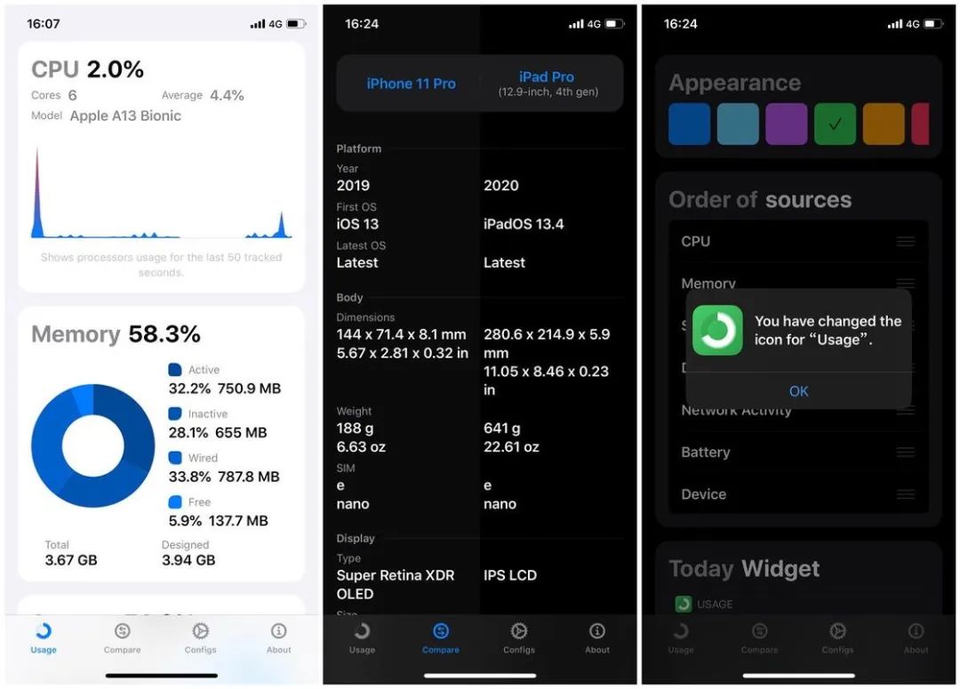 @Snow:Usage 是一款颜值颇高的手机状态监控应用,它内置 8 种主题配色,并且支持深色模式。Usage 可以实时反馈设备的 CPU、内存、存储、网络通讯、电池等运作情况。应用提供了通知中心小部件,即使不在应用内,你也可以随时调用小部件了解设备运作情况。如果你是一位开发者,这款应用的数据可以为你的测试提供参考。