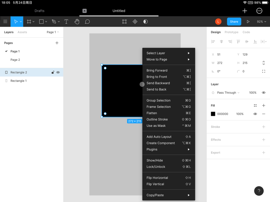 简单来看 Figurative 就是将 Figma 打包成了一个 iPadOS 应用,因此它几乎完整保留了 Figma 的所有使用体验,甚至是右键菜单也可以完全正常使用,可以说和桌面浏览器上的体验几乎一模一样。