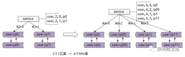 再次看一眼扩容前的架构,分两个库,假设每个库1亿数据量,如何平滑扩容,增加实例数,降低单库数据量呢?三个简单步骤搞定。