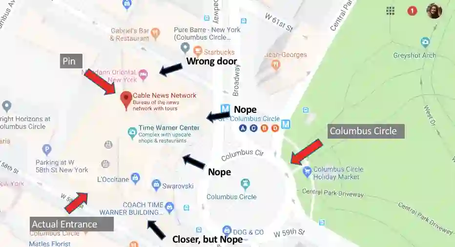CNN 总部的入口在谷歌地图上的显示。只有左下角那个才是正确的入口,其他在地图中显示的都不是正确的入口。图源:I get lost when I travel, and a new report says you do too
