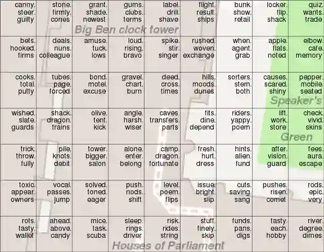 伦敦议会大厦附近用 what3words 写出来就是这样的。而如果用谷歌地图,大概只能识别「议会大厦」「大本钟」和「Speaker's Green」这三个地方。图源维基百科。