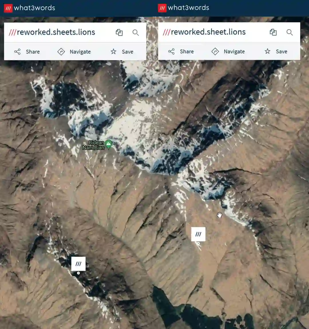 不过,如果把这个概率乘以全世界的 57 兆个方格,那么总能有几个地方的名称,拆分出来的词语只有细微的差别。比如 reworked.sheets.lions 和 reworked.sheet.lions,一个字母的区别,却只隔着 1.83 km 的距离。
