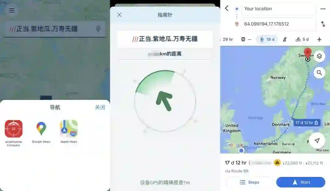 从左至右:what3words 支持的导航软件;自带的 GPS 指南针;分享至谷歌地图后的导航信息。