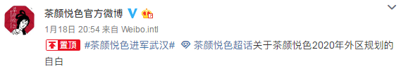 【茶颜悦色确定进军武汉市场】1月19日讯,网红茶饮“茶颜悦色”官方微博发声,针对近期公司年底规划被外泄的消息做出正式回应,茶颜悦色2020年将在长沙以外的地区开拓市场,但目前暂不考虑北上广地区。据多方消息证实,茶颜悦色下一步预计将相继进军武汉、常德市场。此外,茶颜悦色称仍然会采用直营模式,不加盟,不做代理。并称,鉴于自身能力问题,没有将长沙外的首店选在北上广深,但是北上广深一定会来的。茶颜悦色是2013年在长沙创立的新式茶饮品牌,主打中国风。(中国饮品快报)