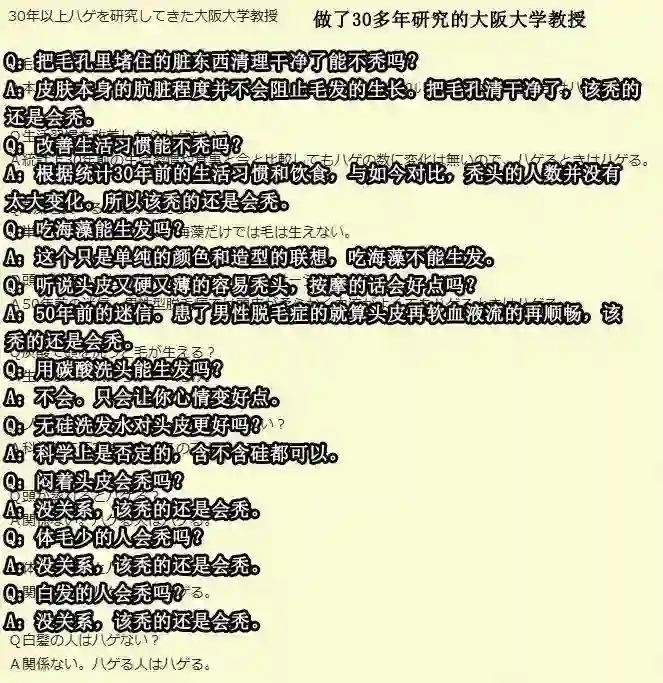 前一段时间,号称“日本研究秃头第一人”的日本大阪大学板见智教授,给想依靠个人的奋斗实现生发事业的脱发群众泼了一盆冷水。在NHK广播《脱发的科学》节目中回答问题时,他的中心思想只有一句话:什么方法都没用,该你秃还是得秃。