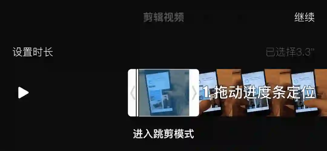 虽然我们最终发布的是「短视频」,不代表我们剪辑的原材料也是。甚至有时你需要从电影原片里截取几秒的镜头来使用。在 猫饼 的剪辑页面,你可以滑动进度条快速定位起始点,然后拖动选择框完成选取。