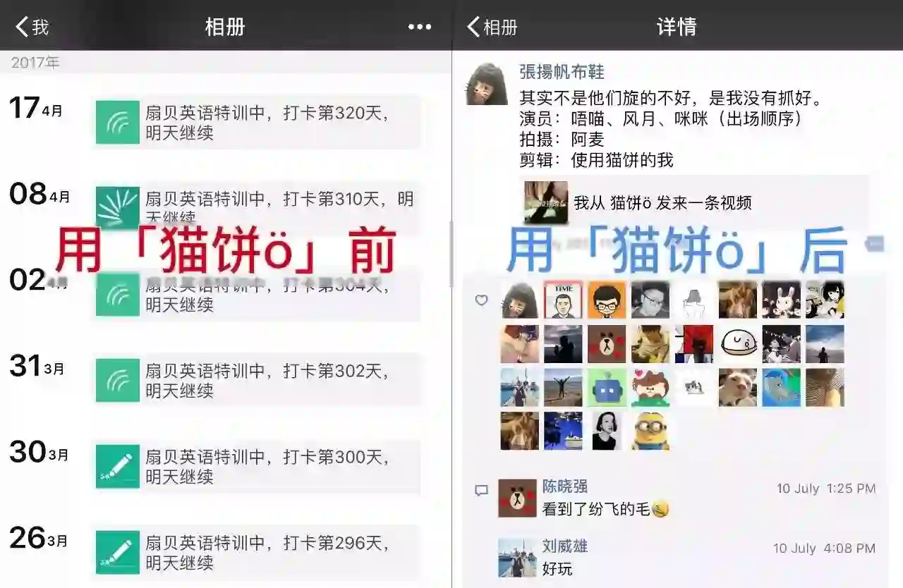 或长或短,从创作的角度,猫饼 提供的脚本也即是剧本。使用者跟着剧本自导自演,轻松制作出一段高质量的视频。像我这种整天只会拍应用、插件介绍,毫无生活情趣的人,跟着这些脚本也收割了不少朋友圈的点赞。要知道我平时只会默默的分享扇贝打卡记录。