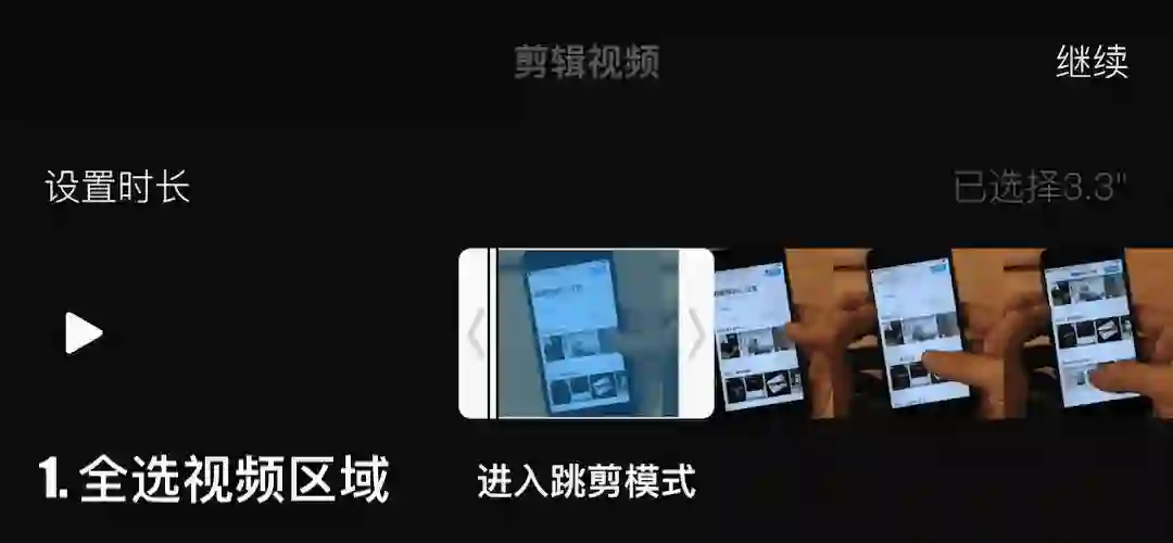 还有一些时候,我们会一个镜头拍到底,但是视频里有很多片段需要抽取,挨个裁剪就太麻烦了。猫饼独有的「跳剪」功能可以十分高效的完成这个任务,在编辑的时候进入跳剪,你可以轻松做出下图的效果:
