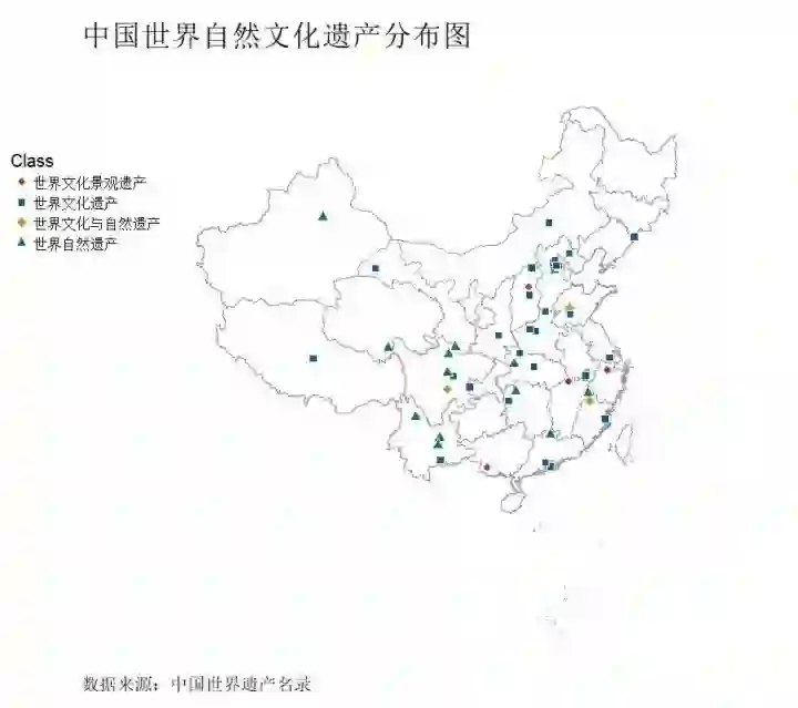labs(title="中国世界自然文化遗产分布图",caption="数据来源:中国世界遗产名录")+