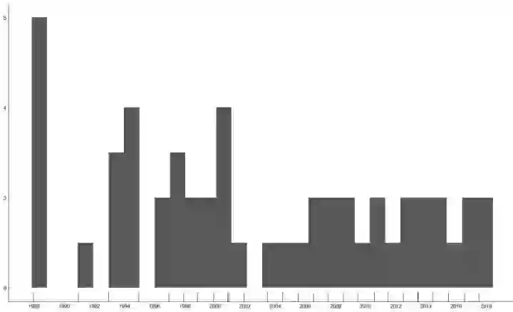 mydata<-read.xlsx("./data/yichan.xlsx",sheetName="Sheet1",header=T,encoding='UTF-8',stringsAsFactors=FALSE,check.names=FALSE) mydata$Time<-ymd(mydata$Time) ggplot(mydata,aes(Time))+ geom_histogram(binh=30)+ geom_rug()+ scale_x_date(date_breaks="2 years",date_labels = "%Y")+ theme_void() %+replace% theme( axis.text=element_text(), plot.margin = unit(c(1,1,1, 1), "lines"), axis.line=element_line() )