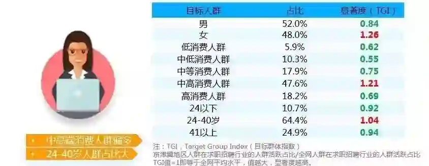 ▌京津冀求职招聘人群画像:24-40岁中高端消费者,娱乐生活偏好腾讯系应用
