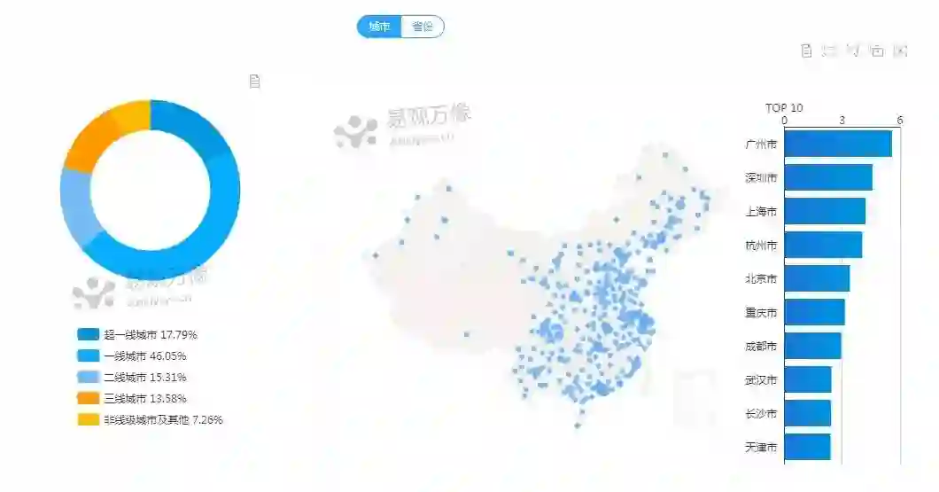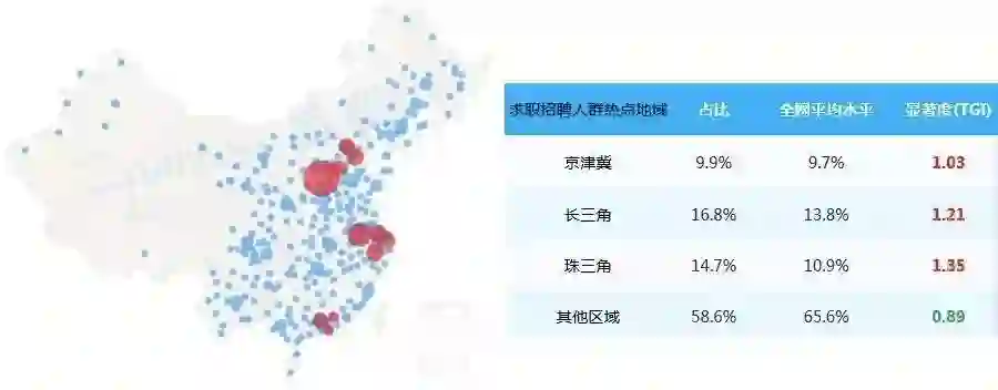 易观万像显示,一线城市及其周边区域是求职招聘的需求集中地区,其中京津冀、长三角、珠三角为热点区域,其显著度(TGI)高于全网平均水平;求职招聘人群在这三个热点区域的占比超40%。