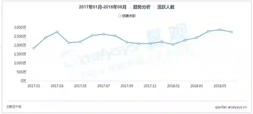 招聘行业一直流传着“金三银四”的说法,从每年2月开始,求职招聘行业都将迎来其旺季。易观千帆数据显示,2017年2月和2018年2月,求职招聘行业月活人数,都有较为明显的增长,随即在5月恢复平稳状态。