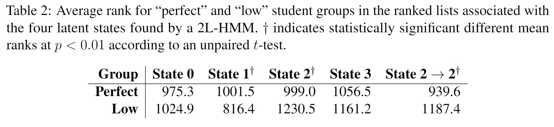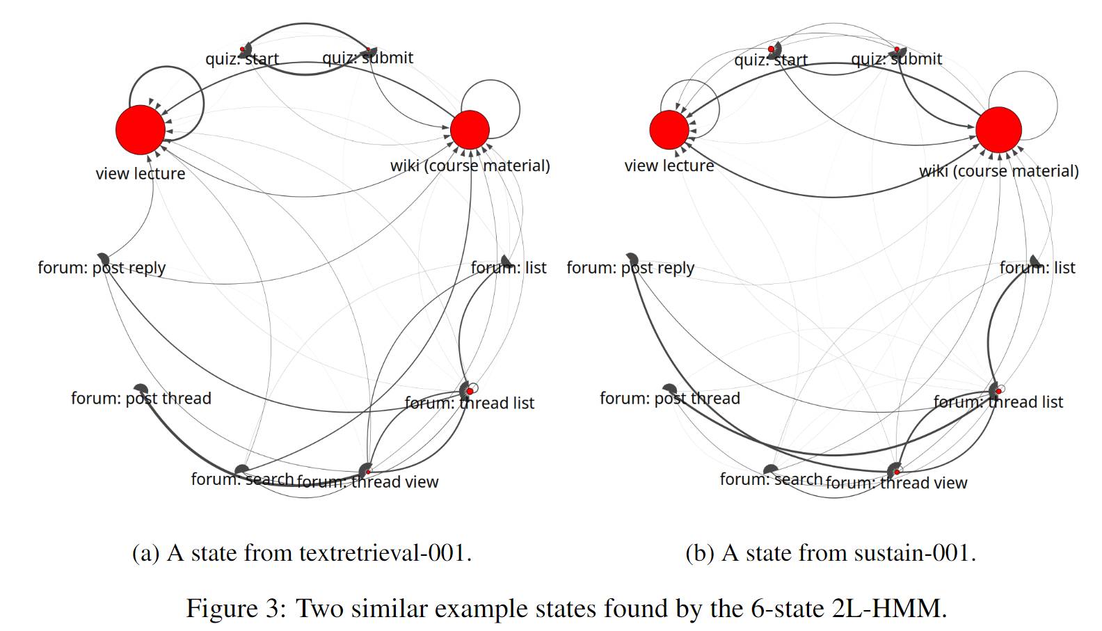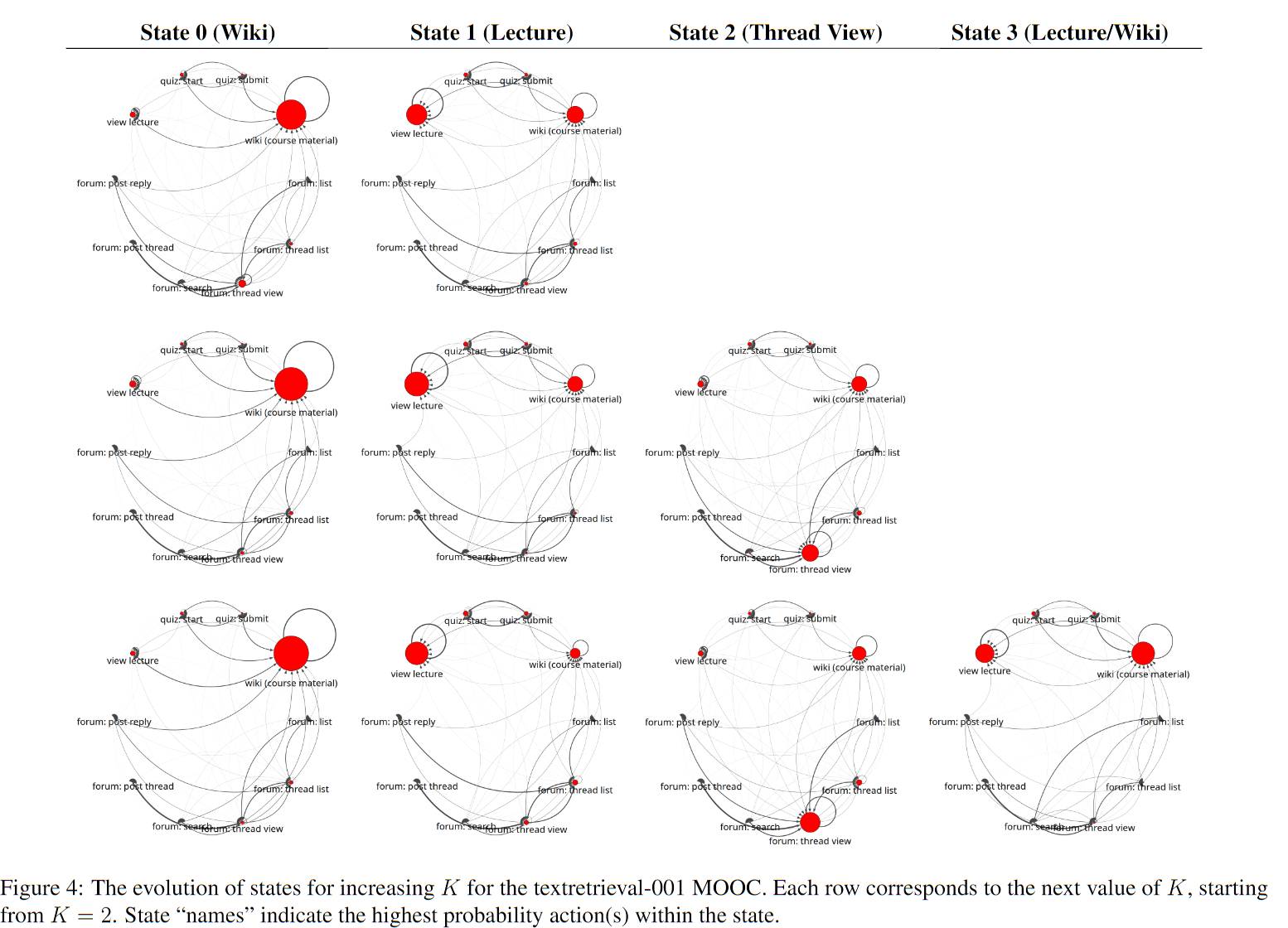 1、隐状态的效果展示:点的大小是单个行为的Pagerank值,反映出这种行为模式的主要行为,边的粗细是转移概率,反映这种模式下行为之间的关系。作者对比了不同隐状态的点和边,以及不同课程的相似的隐状态。